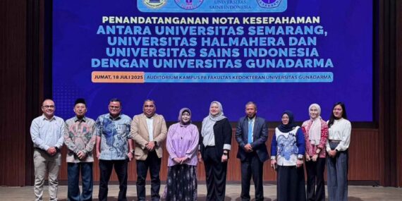 Depok, 18 Juli 2025 – Universitas Sains Indonesia (USI) menandatangani nota kesepahaman (MoU) bersama tiga perguruan tinggi nasional, yaitu Universitas Gunadarma, Universitas Halmahera, dan Universitas Semarang. Kegiatan ini berlangsung di Auditorium Fakultas Kedokteran Kampus F8 Universitas Gunadarma, sebagai wujud komitmen bersama dalam memperkuat kemitraan akademik antarperguruan tinggi di Indonesia. Penandatanganan MoU ini mencakup kesepahaman di berbagai bidang seperti peningkatan